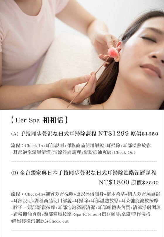 | Her Spa 和和恬-手技同步贅沢な日式耳掃除課程-靜心凝神聆聽與身體的對話!經常被忽略的耳部,交由日本專業手技團隊徹底大掃除,深層體驗一場SPA之旅只要1,299元起即可享有【Her Spa 和和 售價:1299 我要購買 |