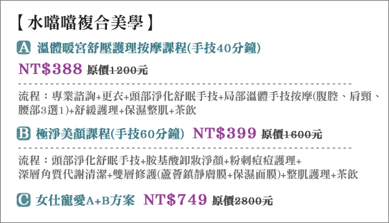 | 水噹噹複合美學-美顏/按摩課程-忙碌已久的妳,累了嗎?天冷時就該好好寵愛自己,由裡到外的細心呵護,宛若重獲新生般舒服自在。只要388元起即可享受【水噹噹複合美學】原價最高2800元美顏/按摩課程:(A 售價:388