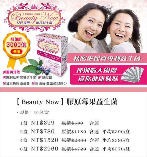 因為我自己也想要了解Beauty Now-膠原莓果益生菌,所以到處尋找資訊做功課.整理了GOOGLE上關於Beauty Now-膠原莓果益生菌搜尋前幾名排序的資料來輔助!google找一下有些人再熱烈討論Beauty Now-膠原莓果益生菌.Beauty Now-膠原莓果益生菌也有些網路上部落客的評價也值得我們參考.KEVIN也嘗試積極推荐,並介紹我該商品優缺點。 |  | Beauty Now-膠原莓果益生菌-女性最私密的保養秘訣!益生菌、巴西莓、膠原蛋白與蔓越莓配方,由內而外呵護妳,展現最有自信女人味!平均每盒最低只要370元起(含運)即可購得【Beauty Now】 售價:370