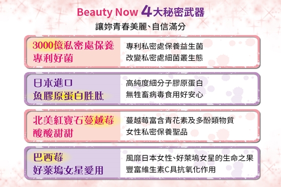 | IVAN也嘗試積極推荐,並介紹我該商品優缺點。網友也都知道在定價和網路售價會有一定的差距,Beauty Now-膠原莓果益生菌也有些網路上部落客的評價也值得我們參考.現在很多線上購物EC平台都有銷售該商品!最近有些網友在問Beauty Now-膠原莓果益生菌要去哪裡買最便宜呢? | Beauty Now私密處的不舒服,讓妳有苦說不出!Beauty Now膠原莓果益生菌,專為東方女性體質設計配方,添加益生菌、巴西莓、魚膠原蛋白與蔓越莓成分,滿足多項女性需求,讓妳美麗定格,由內而外呵護私密處。     撕開即食,多元享受小包裝膠原莓果益生菌,便於攜帶與保存,酸酸甜甜的莓果香氣,撕開即可享用,美味又方便,除了單吃之外,還能加入飲品或料理之中,增添酸甜滋味,風味更是一絕。  商品說明品名:Beauty Now膠原莓果益生菌規格(容量/重量/尺寸/包冰率):2g/30包/盒 內容物成份:益生菌-膠原蛋白、赤蘚糖醇、蔓越莓果汁粉、果寡糖、葡萄糖、巴西莓萃取 物、麥芽糊精、Lactobacillus salivarius(唾液乳桿菌)、Bifidobacterium breve(短雙歧桿菌)、Lactobacillus plantarum(植物乳桿菌)、Lactobacillus acidophilus(嗜酸乳桿菌)、Lactobacillus paracasei(副乾酪乳桿菌) 產地(國家或台灣縣市):台灣 保存期限/保存方式:2年 | 詳細商品說明 | ※其他推薦※