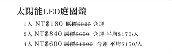 | 太陽能LED庭園燈-讓居家生活更有品味!白日儲蓄太陽能,入夜感應光線昏暗自動亮燈,不需繁瑣安裝作業,節能省電又美觀!平均每入最低只要150元起(含運)即可購得太陽能LED庭園燈1入/2入/4入。 售價:150