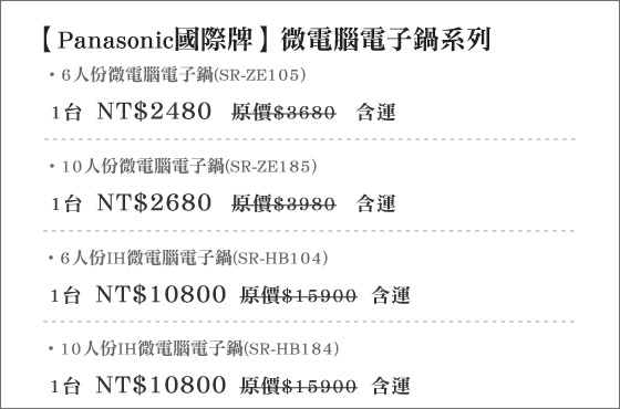| DENNY也請我幫忙收集該商品資料!當今網購市場很競爭,各大購物網為求好業績無所不用其極,殺價毫不手軟。網友也都知道在定價和網路售價會有一定的差距,google找一下有些人再熱烈討論Panasonic國際牌-微電腦電子鍋系列.DENNY一向是個理性的消費者,能讓他讚賞的商品不多了! | 獨家技術 帶出米飯的極致口感與美味   .jpg)  商品特色●瞬間大火力,帶出米飯的極致口感與美味●鑽石鍋釜,均勻加熱更顯完美口感●可承受尼龍刷11萬次不磨損●智慧型控制炊煮,依照不同階段所需加熱6人份微電腦電子鍋(SR-ZE105)/10人份微電腦電子鍋(SR-ZE185)   6人份IH微電腦電子鍋(SR-HB104)/10人份IH微電腦電子鍋(SR-HB184)        商品規格【Panasonic 國際牌】6人份微電腦電子鍋SR-ZE105顏色:白色系 產地:泰國 商品尺寸(材積):261寬x385深xx201高mm 電壓/頻率:110V/60Hz 產品重量:3.1KG 容量:6人份 內鍋:鑽石微粒底部波紋鍋 配件:附可調高度蒸籠 保固:1年 電檢字號:R31221 【Panasonic 國際牌】10人份微電腦電子鍋SR-ZE185容量:10人份 內鍋/厚度:鑽石厚黑鍋/2.0mm 尺寸(mm)寬x深x高:261x385x241 保固:一年 電檢字號:R31221 【Panasonic 國際牌】6人份IH微電腦電子鍋SR-HB104機體尺寸(高X寬X深):20.1 X 25 X 32.1 CM 重量:約4.6 kg 坎煮火力:1200 W 內鍋/厚度:鑽石銅釜/1.7 mm 保固:1年 產地:日本 電檢字號:R31221 【Panasonic 國際牌】10人份IH微電腦電子鍋SR-HB184容量:10人份 電源/頻率:110V/60Hz 炊煮火力:1400W 內鍋/厚度:鑽石銅釜/1.7mm IH電磁感應加熱:全面發熱5段IH 商品尺寸:279寬x348深x232高(mm) 重量:5.5KG 產地:日本 保固:一年 電檢字號:R31221 | 詳細商品說明 | ※其他推薦※