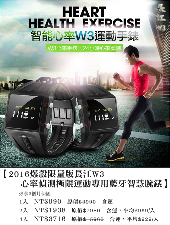 | 2016爆殺限量版長江W3心率偵測極限運動專用藍牙智慧腕錶-運動心時代!健身紀錄、睡眠監測、撥打電話,多項功能使用方便,運動最佳陪伴者,戴上手就是你的貼身小秘書平均每入最低只要929元起(含運)即可購 售價:929