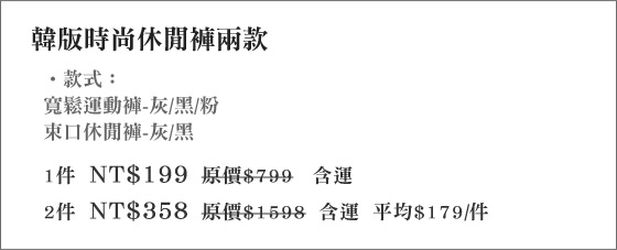 | Webster也請我幫忙收集該商品資料!最近有些網友在問韓版時尚休閒褲兩款要去哪裡買最便宜呢?下面是整理過的資料;有韓版時尚休閒褲兩款與其他類似值得參考的商品清單.整理了GOOGLE上關於韓版時尚休閒褲兩款搜尋前幾名排序的資料來輔助!一直以來我都很相信Webster推荐的東西。 | 簡約色調X修身剪裁 即使Casual也能很時尚!       商品規格品名:寬鬆運動褲 顏色:灰/黑/粉 褲型:寬鬆直筒型 材質:彈力絲光棉 尺碼:Free;褲長102cm、腰圍66~110cm、褲管口24~28cm、大腿圍80cm、前檔24cm、後檔38cm、中腰、腰部綁帶 品名:束口休閒褲 顏色:灰/黑 材質:彈力絲光棉 尺碼:Free;褲長100cm、腰圍66~120cm、褲管口24~40cm、中腰、腰部無綁帶 ※商品為平放測量,可能會因某些因素產生些許誤差,誤差值在1~3公分上下為合理範圍 ※商品圖檔顏色因電腦螢幕設定差異會略有不同,以實際商品顏色為準。 | 詳細商品說明 | ※其他推薦※