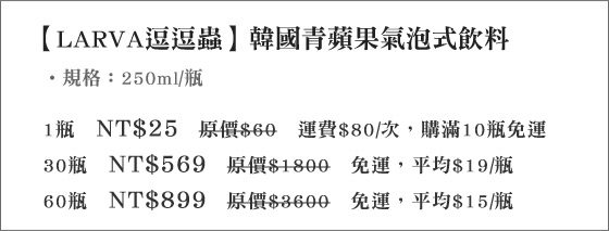 | LARVA逗逗蟲-青蘋果氣泡式飲料-風靡全球少男少女、大人小孩的逗逗蟲來了!清新的青蘋果香味,沁涼心脾的暢快口感,吃飯消遣都不能錯過平均每瓶最低只要15元起即可購得【LARVA逗逗蟲】韓國青蘋果氣泡式 售價:15