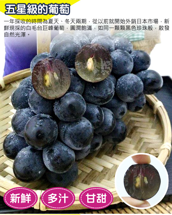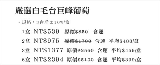 網路價格隨時會調整,請以原網購平台資料為準!下面是整理過的資料;有嚴選白毛台巨峰葡萄與其他類似值得參考的商品清單.整理資訊大致有分享文、開箱文、試用文、評鑑文、推薦文、是否便宜、優缺點等資訊.最近有些網友在問嚴選白毛台巨峰葡萄要去哪裡買最便宜呢?售價隨時會調整;特價有時效性,有需要的人動作要快! |  | 嚴選白毛台巨峰葡萄-新鮮現採白毛台巨峰葡萄,飽滿圓潤外型,宛如珍珠般耀眼!肉質佳、汁多味美,無敵魅力凡人無法擋!平均每盒最低只要399元起(含運)即可購得嚴選白毛台巨峰葡萄1盒/2盒/3盒/6盒(3台 售價:399