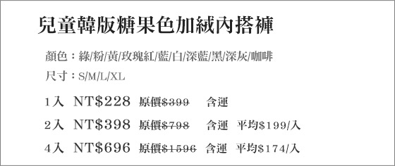 | 兒童韓版糖果色加絨內搭褲-糖果系女孩甜心!加絨內搭褲好穿好搭、保暖又時尚,多款顏色選擇,糖果色系每款都好看,全都帶回家慢慢搭!平均每入最低只要174元起(含運)即可購得兒童韓版糖果色加絨內搭褲1入/2 售價:174