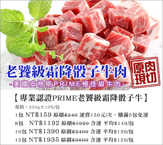| 專業認證PRIME老饕級霜降骰子牛-吃好肉過好年!精挑細選高品質的Prime級牛排,細切分為一口大小骰子牛,飽嚐鮮嫩多汁肉味濃的頂級滋味平均每包最低只要129元起(5包免運)即可享有專業認證PRIME 售價:129