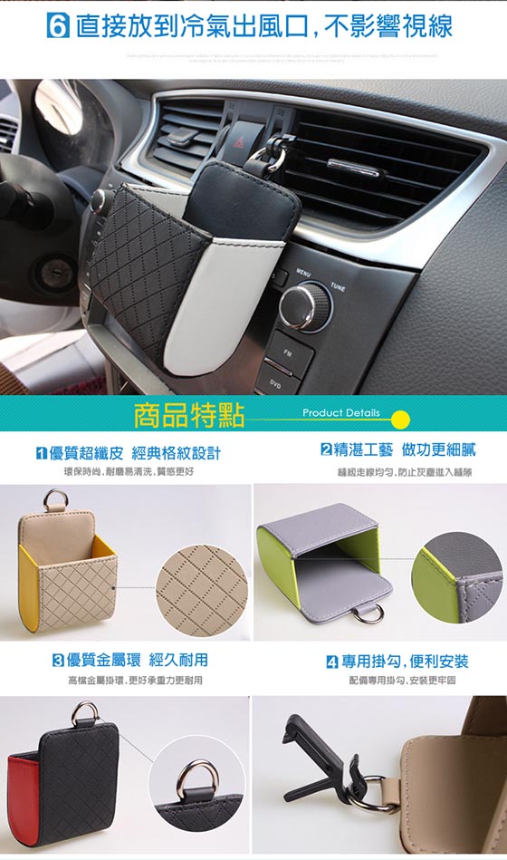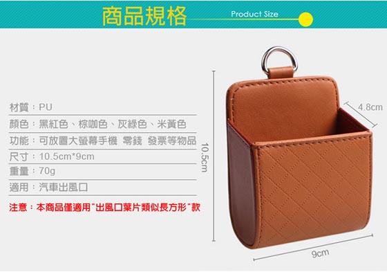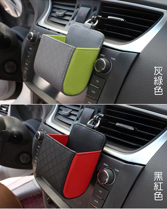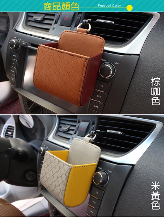 車內精心的收納桶,零錢包、手機、香菸、筆終於不再放得亂七八糟! ≣汽車出風口手機置物桶≣明明車裡東西就沒多少,可為什麼需要用紙用筆卻還要東翻西找?在出風口掛上一個置物收納桶,不僅僅不會遮蔽開車視線,讓你翻找小東西更是容易!手機、筆、零錢包等零碎雜物整齊歸類,取用也簡單,如此也能讓你車中環境顯得更乾淨!      商品規格汽車出風口手機置物桶/手機收納袋 材質:PU皮 尺寸:10.5*9cm 用途:收納手機、零錢等小物 顏色:灰綠色、棕咖色、米黃色、黑紅色 重量:約70g 產地:中國