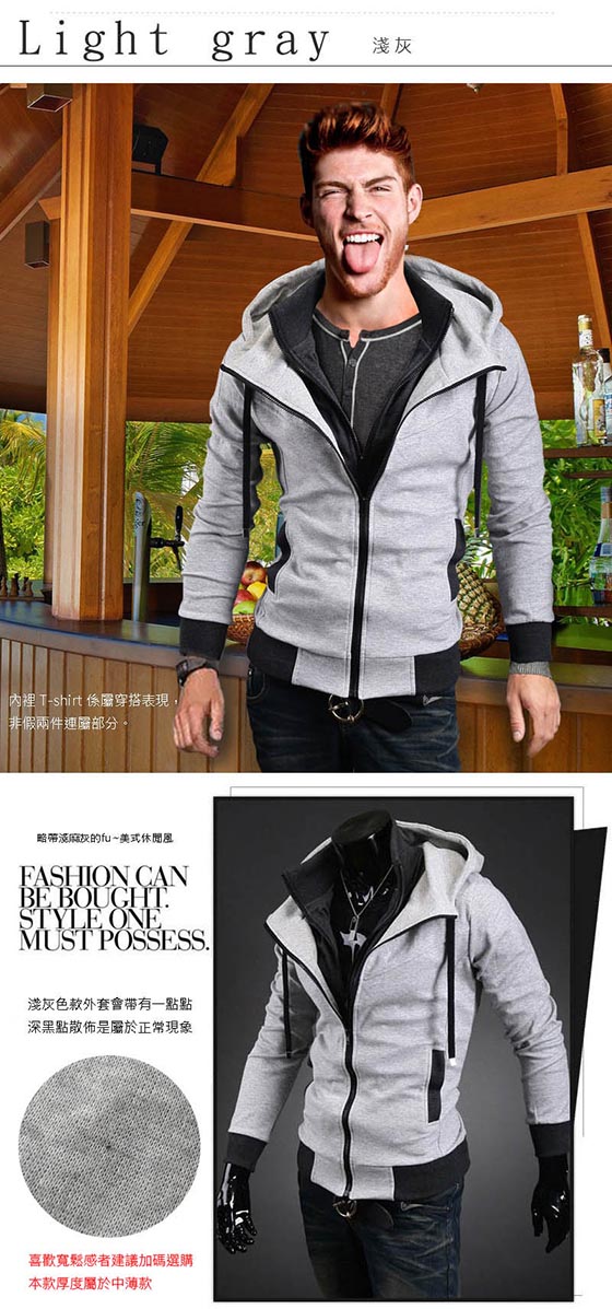 | 假兩件型男經典連帽外套-秋冬型男時尚入手款!多層次設計,棉材質舒適保暖,細節用心呈現,撞色線條搭配,穿搭出簡約有型平均每件最低只要385元起(含運)即可購得假兩件型男經典連帽外套1件/2件/4件,顏色 售價:385