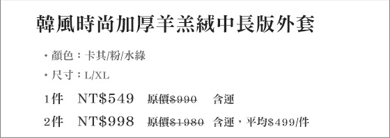 ![]() 六星級柔絲絨枕套/雙人立體羽絲絨暖被 售價:199 我要購買 六星級柔絲絨枕套/雙人立體羽絲絨暖被-享受極致保暖!採用羽絲絨材質,輕盈蓄熱佳、透氣舒適手感,擁有亮麗多種顏色!每個夜晚的期待,舒適入眠!只要199元起(含運)即可購得原價最高3380元六星級絲絨枕套 | ![]() 迷你鑽石小積木-主題餐廳系列 售價:229 我要購買 迷你鑽石小積木-主題餐廳系列-積木狂熱者不可錯過,給孩子發揮創造的好玩具!訓練空間感、色彩、動手做的積極個性,親子互動的好夥伴!平均每組最低只要229元起(含運)即可購得迷你鑽石小積木-主題餐廳系列1 | ![]() 珍腸一生-香腸系列 售價:74 我要購買 珍腸一生-香腸系列-檔檔破千熱賣!你吃過了沒?採用100%自製純豬油塊,食用超安心!獨特傳統新滋味,口口皆是肥美鮮甜!只要74元起即可購得【珍腸一生】原價最高1600元香腸系列:(A)風味香腸1包(2 |