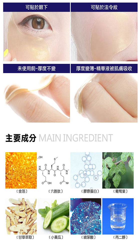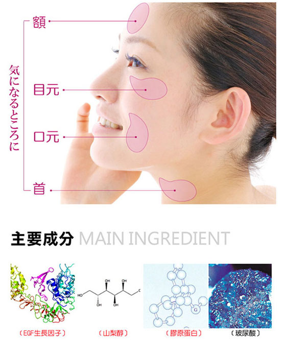 使用方式:於清潔肌膚後以刮勾取出眼膜將眼膜貼合於眼下(或其他想加強保養部位)。經15分鐘後即可取下眼膜。不需再清洗。加以按摩加強吸收即可。