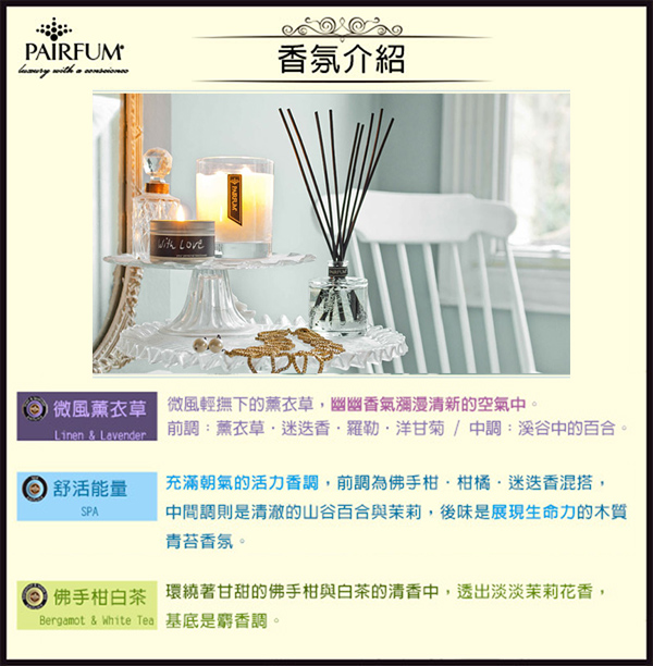 | PAIRFUM-經典擴香禮盒-典藏藝術天然香氛,享受與大自然的親密接觸!幽幽微風薰衣花香,營造生活優雅輕氛圍!PAIRFUM 經典擴香禮盒 售價:1960