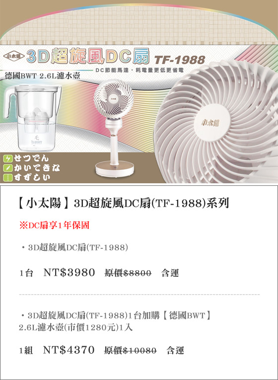 | 小太陽-3D超旋風DC扇(TF-1988)系列-打敗夏季悶熱感!45°、75°、90°立體擺頭角度,涼風更全面!還可優惠加購德國濾水壺,享受健康飲水只要3980元起(含運)即可購得【小太陽】原價最高1 售價:3980